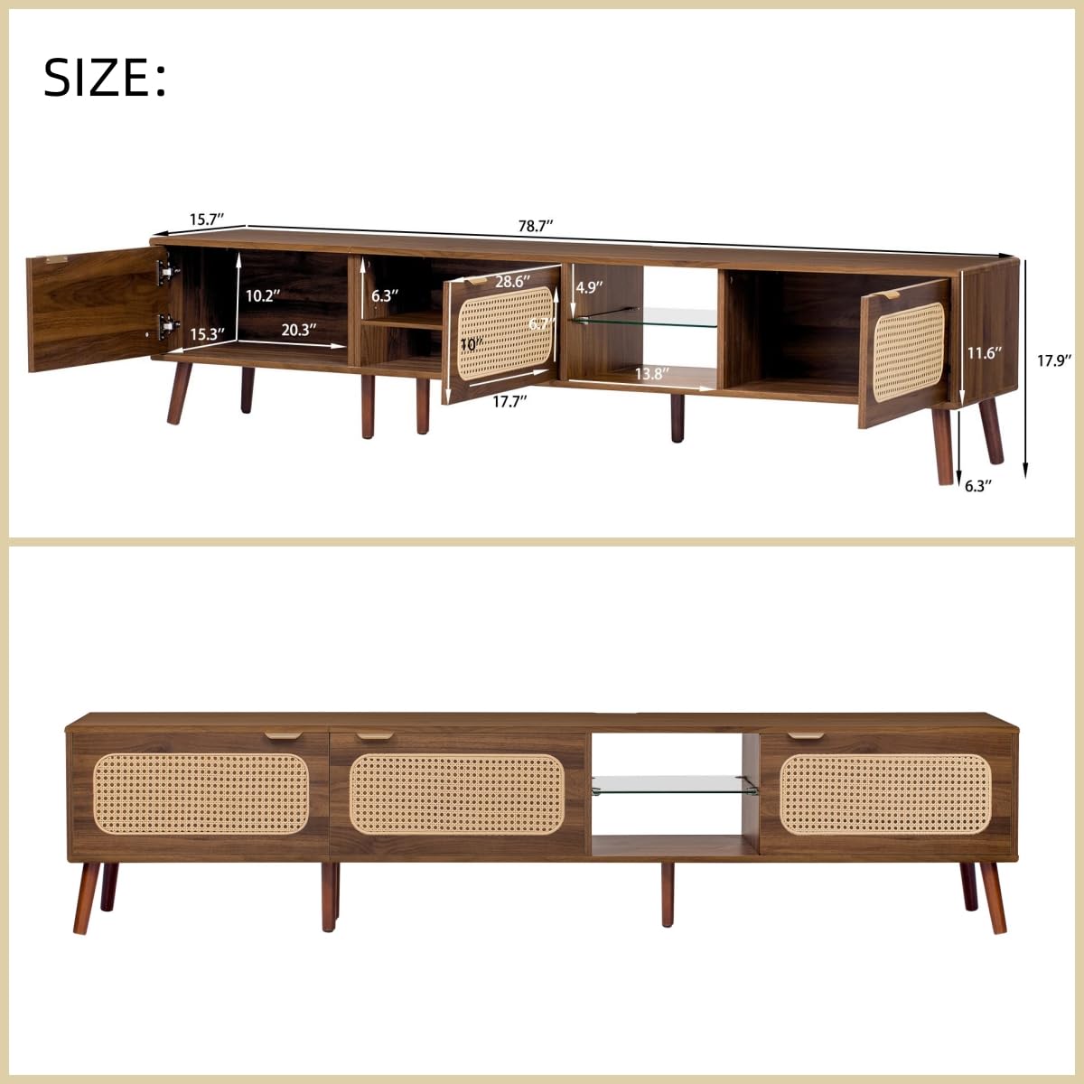 - Timeless Versatile Design: This TV stand effortlessly blends with any decor, from modern to rustic. The mix of woven rattan drawers and a sleek glass shelf creates a perfect balance of texture and transparency for your space. If there is any problem, please visit our website Merax.com or contact us via this email: [email protected], call us: 626-912-8886
