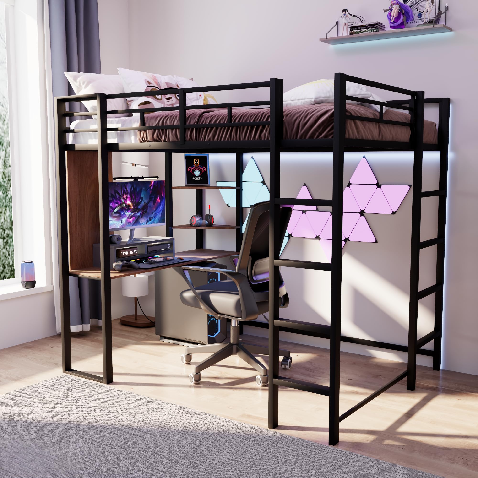 - Space-saving solution. The loft bed includes a desk and two shelves integrated to the metal frame and has 59 of under-bed clearance.