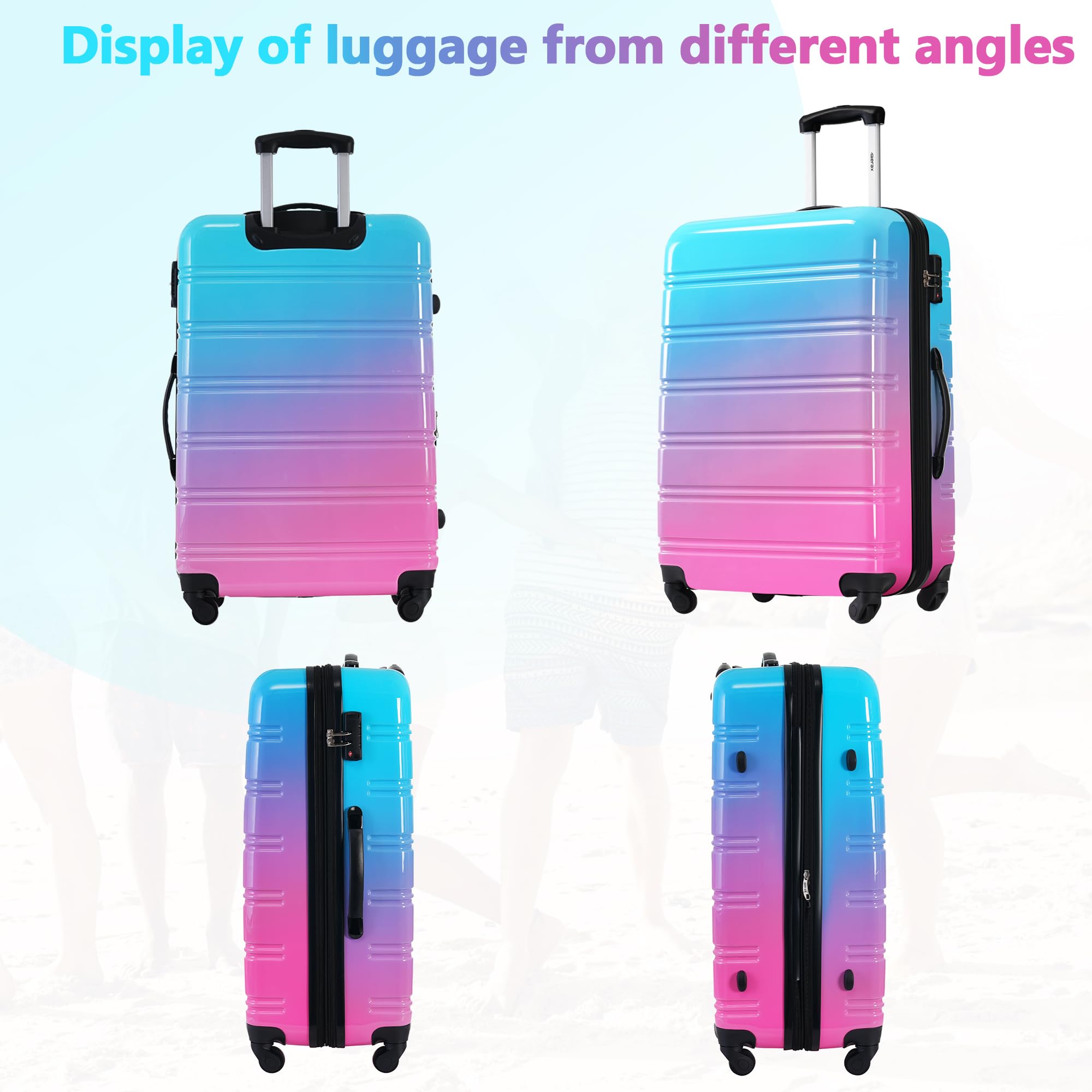 - Design:Luggage is made of high quality PC materials for hardshell,covered with a protective film which can be removed before use.The bright and unique gradient color design combines practicality and aesthetics, making it an ideal choice for travel.