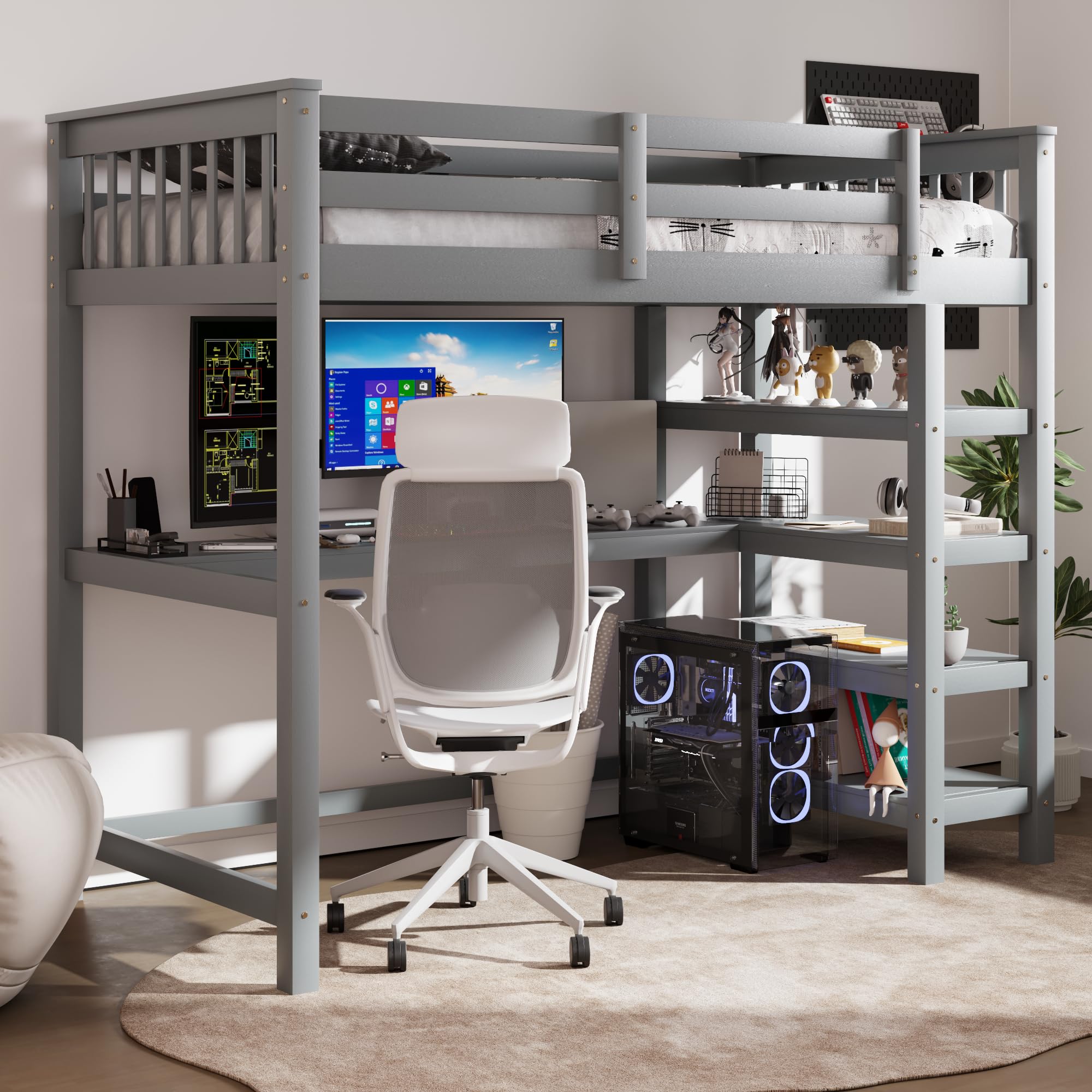 Merax Wood Loft Bed with Desk : Twin Size Loft Bed with 4-Storage Shelves and Under Bed Desk Solid Wood Bed, Grey