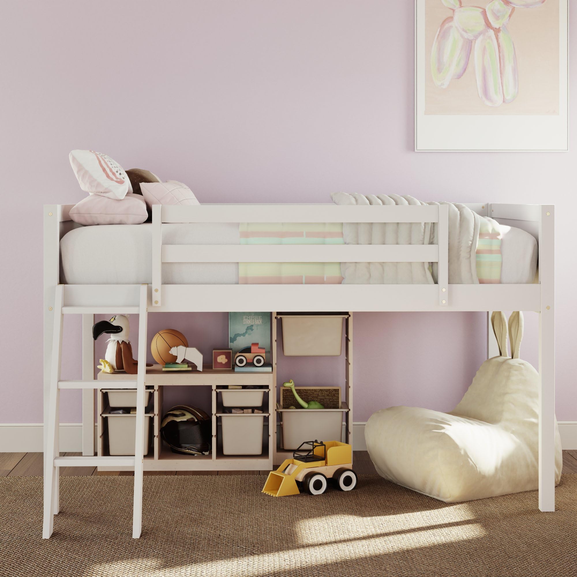Merax Wood Low Loft Bed with Ladder,Wooden Low Loft Bed with Guardrail for Kids or Teens,Space Saving,No Box Spring Needed,Twin Size, White Color